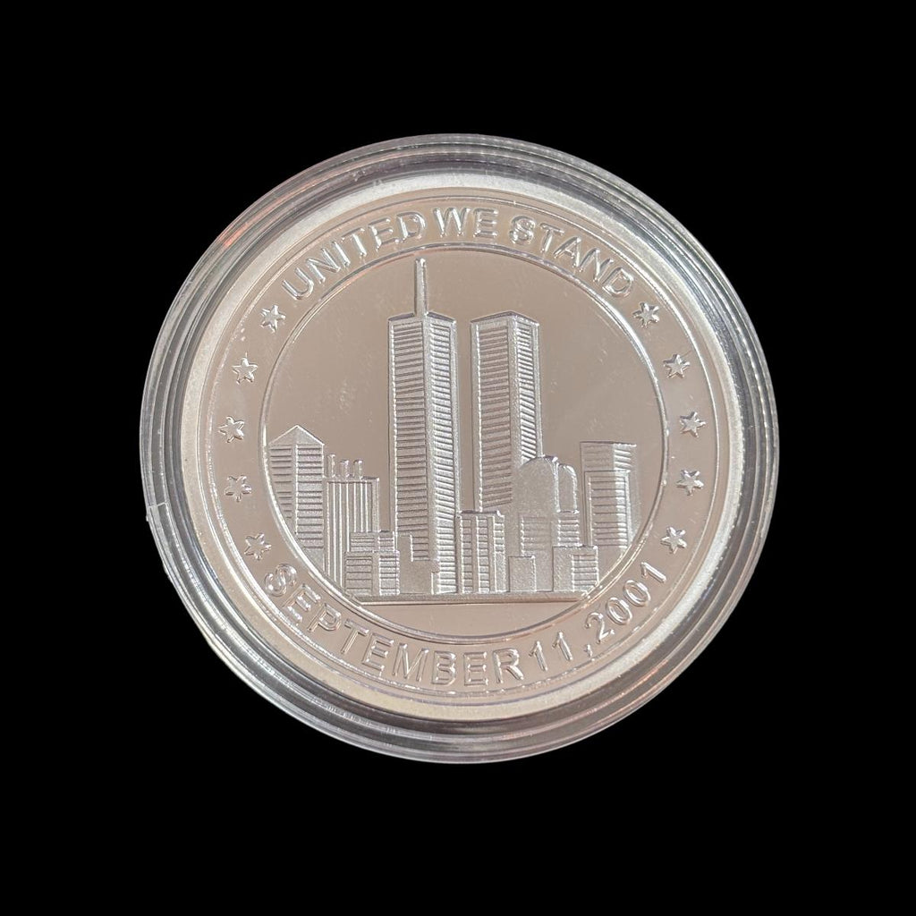 Remember September 11, 2001 - United We Stand" Challenge Coin – Commemorates the unity and resilience of America after 9/11. Features twin towers and eagle motifs, symbolizing strength and solidarity. A tribute to heroes and a nation's unbreakable spirit