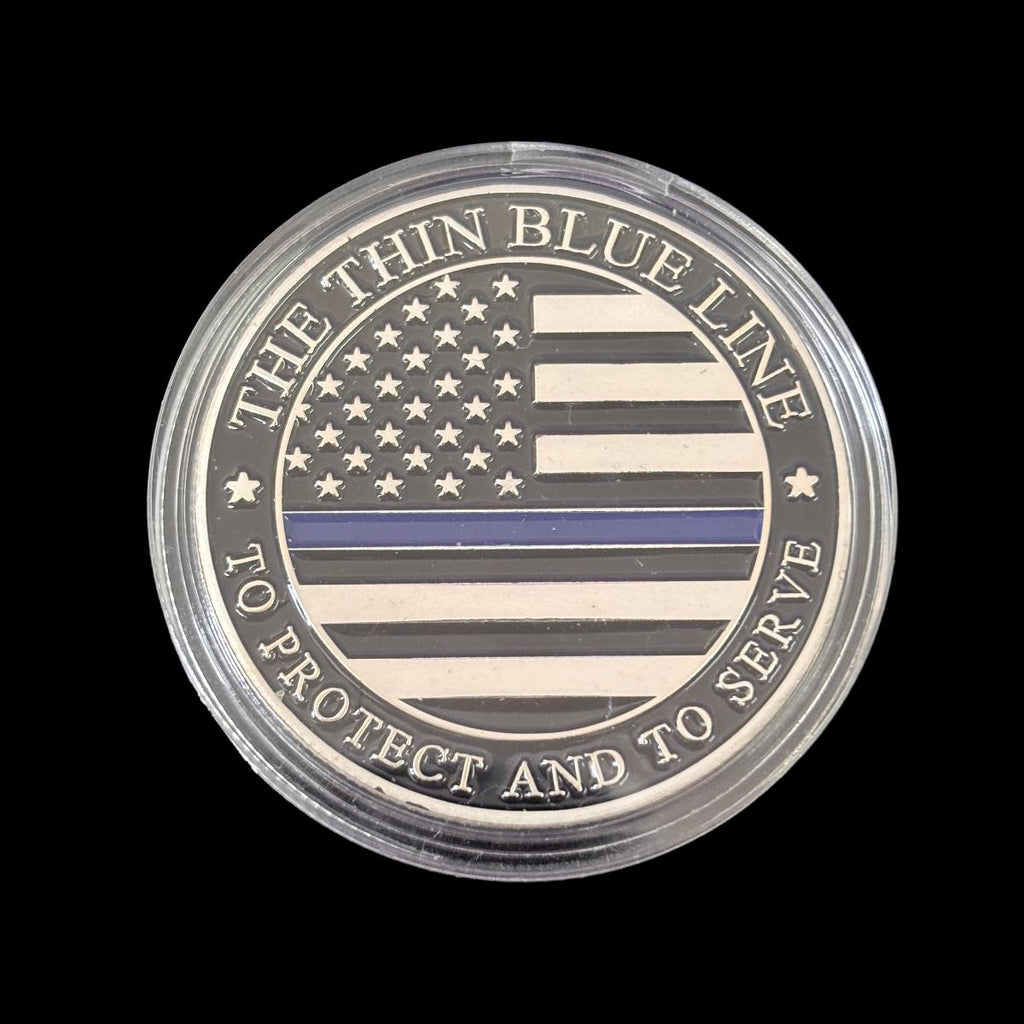 The Thin Blue Line - To Protect & Serve" Police Challenge Coin – Honors law enforcement's vital role with a striking blue line design and police badge. A tribute to officers who stand between order and chaos